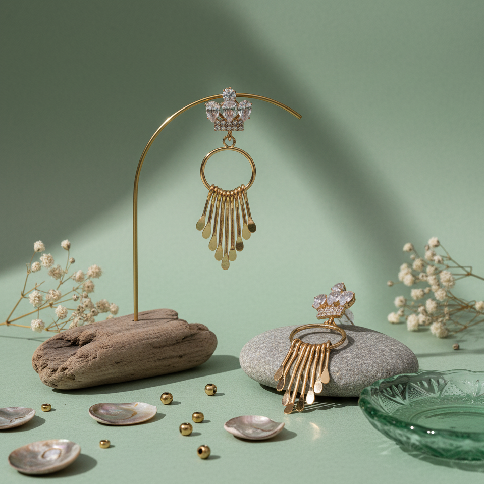 🔗 A circular hoop anchors the design, from which multiple teardrop-shaped gold dangles cascade gracefully.