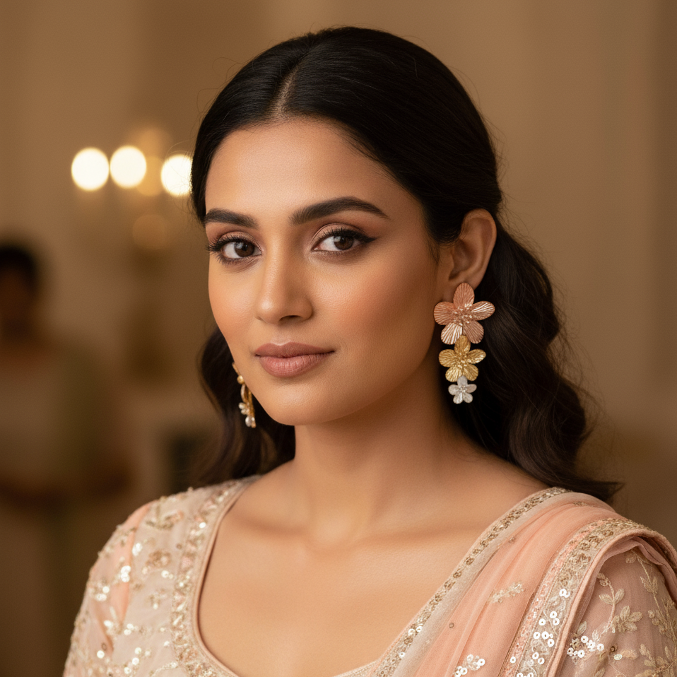 🌟 Each earring features a vertical stack of three textured floral motifs in rose gold, classic gold, and silver tones—creating a graceful gradient of metallic elegance.